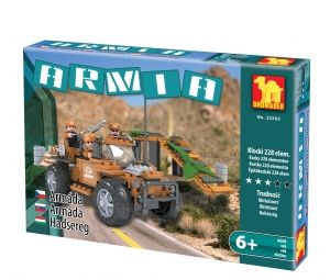 Zestaw klocków Armia to idealna zabawka dla każdego chłopca.Zabawka nie jest trudna do złożenia - poradzi sobie z tym każde dziecko.Jest wykonana z dużą precyzją, wszelkie elementy wyglądają ładnie, co z pewnością pomoże w przyciągnięciu uwagi naszej pociechy.W czasie zabawy dziecko rozwijać może swoją wyobraźnię oraz zdolności manualne podczas składania odpowiednich części.Zabawa może odbywać się całkiem realistycznie, ponieważ w zestawie znajdziemy wszelkie niezbędne rzeczy dla małego żołnierza.Z zestawu możemy zbudować samochód wojskowy.W zestawie znajdują się 3 ludziki.Klocki łączą się z klockami LEGO i COBI! Posiadają Certyfikat Jakości i Bezpieczeństwa CE.ZAWARTOŚĆ:- klocki 228 elementów.WIEK:powyżej 6 latWYMIARY:opakowania 32 x 21,5 x 5 cmUWAGI:Zabawka nieodpowiednia dla dzieci poniżej 3 lat.Zawiera małe elementy lub istnieje możliwość oddzielenia małych elementów, które mogą spowodować udławienie się drobnymi elementami zabawki.