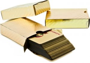 Ekskluzywna talia kart wykonana została z ogromnym naciskiem na każdy szczegół i detal.Niepowtarzalny, złoty, metaliczny kolor, przeplatający się z czerwonymi i czarnymi kolorami figur nada każdej grze prestiżu i zwiększy jej atrakcyjność.Talia składa się z 54 kart i 2 jokerów.Wykonane zostały z plastiku, dzięki czemu są niezwykle trwałe i nie łamią się jak ma to miejsce w przypadku standardowo używanych materiałów.Karty mają bardzo duże i czytelne oznaczenia.Jest to standardowa talia wykorzystywana w większości gier. ZAWARTOŚĆ:Talia 56 kartZłote pudełeczko WIEK:3+ UWAGI: