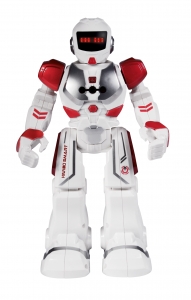 Multifunkcyjny Robot Knabo Smart to świetna zabawka, która każdemu dostarczy rozrywki i zapewni fantastyczną zabawę!Włączamy robota za pomocą przycisku z przodu (ON-OFF).Guzik powyżej służy do hibernacji robota.Po włączeniu zaświecą mu się oczy, robot wyda dźwięki i powita nas kilkoma ruchami.Robot jest gotowy do zabawy.Sterujemy nim załączonym pilotem.Na pilocie mamy przyciski: ślizg w 4 kierunkach oraz chodzenie - również w 4 kierunkach.Zarówno ślizg jak i chodzenie robot może wykonywać w 2 prędkościach.Do tego możemy regulować głośność.Trzy przyciski służą do aktywacji mowy Knabo, który porozumiewa się z nami w swoim języku.Pilotem uruchamiamy także funkcję śpiewu oraz muzyki.Każdą z funkcji możemy zatrzymać przyciskiem Stop.Dodatkową atrakcją jest także przycisk pozwalający na zaprogramowanie robota.Możemy zaprogramować do 15 ruchów, a Knabo odtworzy ich sekwencje.Guzik demo pozwala zaprezentować taneczne umiejętności robota. Zabawka posiada 3 programy demo.Nowością w tej wersji robota jest sterowanie za pomocą gestów dłoni.Zasięg pilota 3-5 m.Czas zabawy max. 3 godzinyŁadowanie 2-4 godzinyRobot nie wymaga baterii, ponieważ posiada wbudowany akumulator, który naładujesz przy pomocy załączonego kablaUSB.Interaktywny Robot Knabo to świetna zabawka, która każdemu dostarczy rozrywki i zapewni fantastyczną zabawę!Wszystkie funkcje sprawią, że Knabo zachwyci każde dziecko i szybko stanie się jego ulubioną zabawką.Robot jest po prostu nieziemski! ZAWARTOŚĆ:- robot Knabo,- pilot,- instrukcja.-kabel USB.