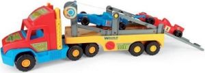 Ciężarówka-laweta o długości 77cm z odpinaną naczepą może służyć do przewożenia samochodów wyścigowych Formuły 1. Pojazd wyposażony jest w najazdy i wciągarkę, dzięki którym wyścigówki wciągane są na lawetę,W zestawie znajdują się 2 autka Formuły 1 a na kartonie znajdują się również wycinanki urozmaicające zabawę.Całość wykonana jest z wysokiej jakości tworzywa sztucznego, odpornego na warunki atmosferyczne, dzięki czemu zabawkę przez cały rok można przechowywać np. w ogródku czy na balkonie.ZAWARTOŚĆ:ciężarówka laweta2 autkaWIEK:3 lata+WYMIARY:zestaw o długości 77,5 cmopakowania 78 cm x 28 cm x 20 cmUWAGI:Nieodpowiednie dla dzieci w wieku poniżej 3 lat.