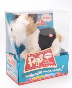 Piesek Figo Foxterier to wyjątkowo mądry szczeniaczek, który zostanie najlepszym przyjacielem Twojego dziecka!Szczeniak utrzymany jest w biało-szarych barwach.Ponadto Figo to świetna alternatywa dla żywych zwierzątek domowych.Piesek idealnie odzwierciedla wygląd żywego szczeniaczka, jest także przyjemny w dotyku, co sprawi, że z pewnością zachwyci najbardziej wymagające dziecko.Mądry szczeniaczek Figo wykonuje Twoje polecenia - wystarczy tylko wypowiedzieć odpowiednią komendę, a on ją wykona!Zabawa z Figo jest niezwykle prosta:Wystarczy wcisnąć przycisk ON/OFF, by uruchomić pieska i wypowiedzieć jedną z komend, na które piesek reaguje:* daj głos* waruj* poproś* siad* zatańcz* zaśpiewaj.Figo nie tylko z chęcią wykona Twoje polecenie, z pewnością Cię zachwyci i rozśmieszy!Gdy po krótkiej chwili piesek nie wykonuje Twojego polecenia, zmień ton lub tempo wypowiadanej komendy, a z pewnością ją wykona.ZAWARTOŚĆ:- interaktywny piesek FigoWIEK:2 +WYMIARY:opakowania: 32 x 27,5 x 15 cmwysokość pieska: 21 cmdługość pieska: 31 cmZASILANIE:3 x baterie AA 1,5 V - załączone baterie testoweInstrukcja użytkowania baterii w RegulaminieUWAGI:Usuń wszystkie elementy mocujące zanim podasz zabawkę dziecku.
