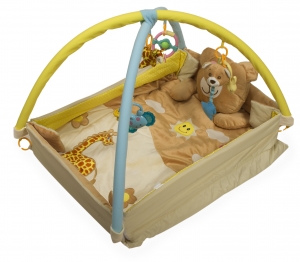 SUPER MATA EDUKACYJNA DLA DZIECI Z MISIEM BEŻOWAWielofunkcyjna mata edukacyjna głową misia wykonana została z kolorowego, miękkiego i wysokiej jakości materiału.Doskonale sprawdzi się jako mata gimnastyczna dla dzieci już od pierwszych chwil życia.Dołączone do niej kolorowe, miękkie zabawki w żywych kolorach i plastikowe grzechotki zachęcą każdego malucha do zabawy i dodatkowo będą pobudzać zmysły i wspomagać rozwój motoryczny każdego maluszka.Mata wykonana jest z pluszowego, przyjemnego w dotyku materiału.Mata będzie rosła razem z maluszkiem. Dziecko może się bawić na niej na 3 różne sposoby:1. Leżąc na pleckach bawiąc się zawieszonymi zabawkami2. Leżąc na brzuszku i ćwicząc mięśnie3. Bawić się na siedząco ulubionymi zabawkamiWIEK:od 3 miesięcyZAWARTOŚĆ:mata-kojecpałąk 2xgłowa misia-poduszkagrzechotka 2xsłonik gryzakpluszowy miś z dźwiękiempluszowa żyrafa-grzechotkaWYMIARY:mata: 75cm x 55cmwysokość wraz z pałąkiem: 40cmWymiary kojca: 80x60x14cmwymiary maty: 105x105x45cmgłowa misia-poduszka: 28cmx26cmUWAGI:Produkt nieodpowiedni dla dzieci poniżej 3 miesięcy.