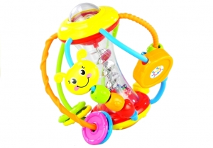 KOLOROWA KULA GRZECHOTKAMagiczna Kula przeznaczona jest dla najmniejszych pociech, które poznają co dopiero otaczający go świat.Kula wyposażona jest w wiele funkcji, które wpłyną pozytywnie na zdolności motoryczne malucha, a kolory i kształty rozbudzą ciekawość dziecka.Zabawka wykonana jest z wysokiej jakości materiałów, starannie wykończona, dzięki czemu zabawa jest całkowicie bezpieczna.Żywa kolorystyka, nowa faktura materiału z którego wykonana jest zabawka zapewnią wiele atrakcji podczas zabaw dla dziecka.Zabawka stymuluje rozwój zmysłu wzroku oraz dotyku.Dzięki zabawie kreatywną kulą dziecko będzie mogło poćwiczyć:- zdolności motoryczne - turlanie, rzucanie- koordynację rozwojową rączek i nóżek- rozwój wyobraźni i zmysłów- rozróżnianie kształtów, kolorów, faktury materiału- rozpoznawanie odgłosów - to wszystko wpłynie pozytywnie na słuch i wzrok dzieckaATRAKCJE ZNAJDUJĄCE SIĘ NA KULI:- zaczynając od wierzchołka znajdziemy obrotowy obrazek z buzią małpki i bananami- po bokach znajdują się przesuwająca gąsieniczka zbudowana z czterech kolorowych elementów- koraliki w kształcie kulek i kwadracików ze śmiesznymi minami, literkami, kształtami i cyferkami- płaskie tarcze w różnych kolorach- obrotowe lusterko- znajdująca się w środku obrotowa spiralka z kolorowymi kuleczkami- na spodzie przycisk z piszczałką- pałąki o różnych fakturach i kolorachWIEK:- Od 3 miesięcyWYMIARY OPAKOWANIA:- Ok. 19,5 x 20 x 17 cmWAGA OPAKOWANIA:- 300 gUWAGI:Produkt nie nadaje się dla dzieci poniżej 3 lat.Zawiera małe elementy, które łatwo połknąć lub które mogą dostać się do dróg oddechowych - NIEBEZPIECZEŃSTWO UDUSZENIA.