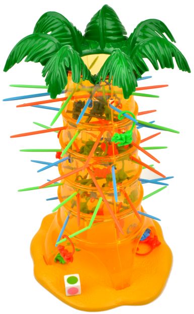 Co możemy zagwarantować?Zwierzaki nie ugryząNie trzeba ich dokarmiaćNie rzucą w was skórką od bananaZapewnią zabawę dla całej rodzinyBierki inne niż wszystkieSpadające Małpy to klimatyczna gra zręcznościowa typu „bierki”, która pozwoli Wam poczuć się jak na wakacjach w Afryce. Jeśli do tej pory nie lubiliście bierek, bo były dla Was zbyt nudne, teraz całkowicie zmienicie zdanie. Spadające Małpy to bierki na miarę XXI wieku, w które można grać z przyjaciółmi lub rodziną – czy masz lat 4, czy 104, te bierki całkowicie Cię pochłoną. Sprawdźcie swoją cierpliwość, zręczność i spryt przy sporej dawce adrenaliny, doskonałej zabawy i salw śmiechu. Uwaga – ta gra wciąga!Zasady gryNa każdym z 5 poziomów drzewa układamy gałęzie - 6 słomek, po 2 w każdym z kolorów (2x niebieskie, 2x zielone, 2x czerwone). Z góry w otwór pomiędzy liśćmi drzewa, wrzucamy wszystkie małpy tak, aby zawisły na gałęziach/bierkach. Jeżeli któraś małpa spadnie na podstawę, podnosimy ją i wrzucamy od góry aż wszystkie będą wisiały na gałęziach. Po rozpoczęciu gry, każdy gracz rzuca kostką i ostrożnie wyciąga z najwyższego rzędu słomkę w kolorze, który wylosował. Małpki, które spadną na sam dół, gracz kładzie przed sobą. Na koniec gry podliczamy nasze naczelne.