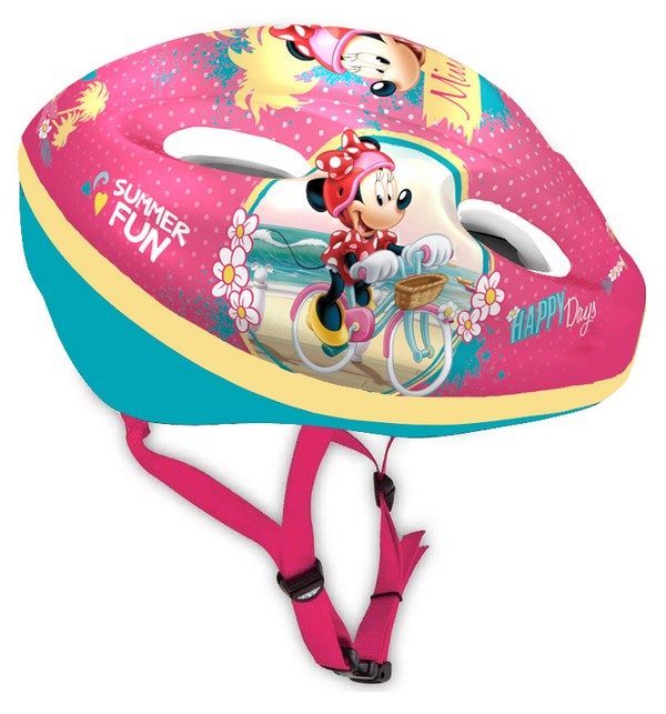 Kask Rowerowy Myszka Minnie DisneyKask jest przeznaczony dla dzieci jeżdżących na rowerze, rolkach, wrotkach, hulajnodze itp. Na zewnątrz pokryty jest warstwą PVC z kolorowymi wzorami przedstawiających bohaterów z bajek Disney.Wnętrze wyściela wysokiej jakości styropian. Kask jest wyposażony we wkładkę z mechanizmem umożliwiającym dokładne dopasowanie kasku do główki dziecka. Po obu stronach kask posiada paski mocujące, zapinane pod brodą na klamrę z miękkim podbródkiem. W powłoce kasku znajduje się system otworów zapewniających wentylację podczas noszenia kasku oraz siatkę chroniącą głowę przed owadami.Kask jest bardzo lekki, spełnia wymagania odpowiednich standardów.