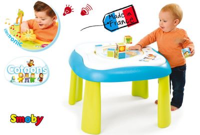 Niebieski elektroniczny stolik ze światłem i dźwiękiem to wspaniała propozycja zabawy dla maluchów. Stolik posiada siedzisko w centralnej części blatu, które doskonale nadaje sie dla mniejszych dzieci (siedzisko można zdjąć i wyprać). Istnieje możliwosc zakrycia siedzonka, tworząc pełną przestrzeń do zabawy. Zabawka rozwijają zręczność, intryguje efektami dźwiękowymi i świetlnymi. To wyjątkowe centrum zawiera także przeplatankę, wiatraczek - kwiatek, grający kwiatek.