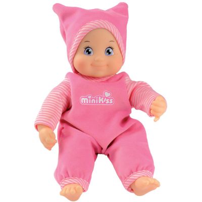 Smoby lalka z serii mini Kiss 27 cm. Interaktywna laleczka. Główka, rączki i nóżki wykonane są z tworzywa, natomiast brzuszek jest materiałowy. Po naciśnięciu brzuszka laleczka daje buziaka.