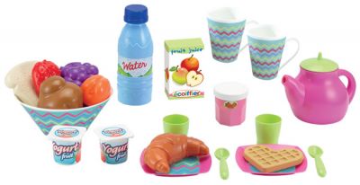 Ecoiffier zestaw śniadaniowy 27 elementówZestaw zawiera:2 talerzyki,2 kubeczki,miseczkę, imbryczek, szklaneczki, łyżeczkę, butelkę wody, sok jabłkowy, 2 jogurty, croissant, babeczkę, tosta, gofra, morelę, winogrona, truskawkę, konfituręProdukt wykonano z bezpiecznego i wytrzymałego tworzywa.Smoby to francuska firma z tradycjami sięgającymi roku 1924, należąca obecnie do niemieckiego koncernu zabawkarskiego Simba-Dickie Group, tworząca, produkująca i dystrybuująca bardzo szeroką gamę zabawek. Dziś produkty Smoby , wytwarzane w większości w Europie, cieszą się ogromną popularnością, a cechuje je najwyższa jakość, bezpieczeństwo i trwałość. Dzięki temu, iż są one stuprocentowym gwarantem radości i dobrej zabawy dla najmłodszych, trafiły już niemal w każdy zakątek świata. Wiek : od 18 miesięcyWymiar:41,5x21x17,5 cmWaga:0,80kg