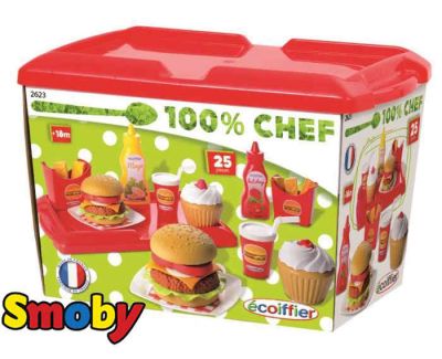 Smoby Ecoiffier Duży zestaw śniadaniowy Lunch 25 el. hamburger ciasteczkaSmoby Ecoiffier Zestaw Na Lunch posiada pojemnik z przykrywką, wewnątrz którego Twój maluch odnajdzie mnóstwo pyszności- hamburgery, frytki, ketchup, musztardę, ciasteczka, talerzyki, kubeczki i sztućce dla dwóch osób- razem aż 25 elementów.Stanowi super wyposażenie do kuchni, cukierni czy przy zabawie w piknik.