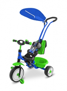 Solidny i bezpieczny rowerek o nowoczesnej stylistyce.Wygodne siedzisko oraz miękkie oparcie zapewniają maksymalny komfort jazdy.Pięciopunktowe pasy utrzymują stabilność dziecka w siedzisku.Rowerek posiada prosty mechanizm działający na zasadzie sprzęgła.Po odłączeniu napędu pedałki mogą obracać się niezależne od ruchu przedniego koła,co przydatne jest podczas prowadzenia rowerka przez rodzica (ruch pedałów nie jest wymuszany przez ruch koła!).Daszek chroni pociechę przed słońcem, a plecak pozwala na zabranie picia czy "skarbów" dziecka naprzejażdżkę.