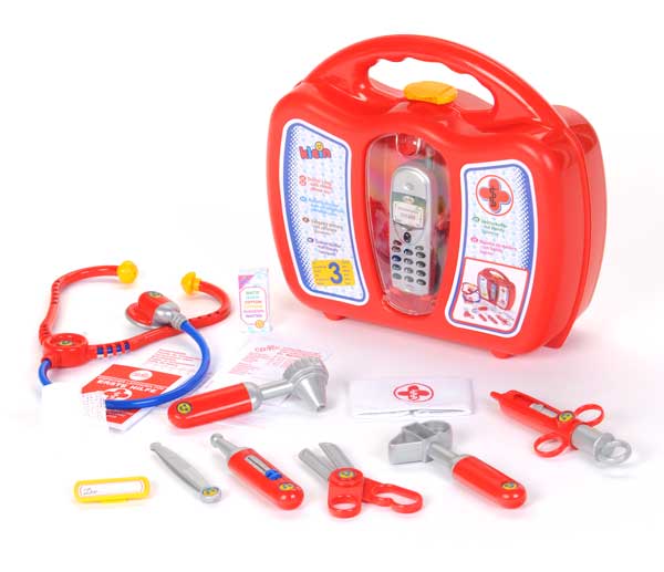 Zestaw lekarski - Praktyczna walizka z komórką i akcesoriami niezbędnymi do badania pacjentów, od firmy KleinW skład zestawu wchodzą między innymi: telefon komórkowy, strzykawka, termometr, stetoskop, otoskop.Marka Klein znana jest na świecie z produktów wykonanych z dbałością o szczegóły, z najlepszej jakości materiałów oraz atrakcyjnego wzornictwa. Zabawki tej marki idealnie trafiają w gusta małych i większych użytkowników. Artykuły oznaczone marką Klein gwarantują świetną zabawę oraz odznaczają się długą żywotnością.Wymiary: 27 x 9,5 x 24,7 cm