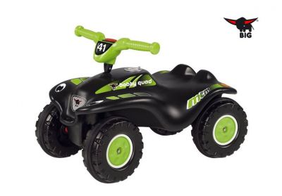 BIG Jeździk Bobby Quad Racing od 3 lat ciche koła Pojazd przypomina prawdziwy quad. Jest stabilny i bezpieczny. Specjalny profil siedziska pozwala na zabawę w dwóch pozycjach siedząc lub klęcząc na jeździku. Dziecko odpychając się nogami z pewnością będzie się prawidłowo rozwijało i świetnie bawiło. Trwała konstrukcja jeździka, gwarantuje długi okres eksploatacji. Posiada specjalne plastikowe ciche koła, mechanizm holowniczy z przodu, hak na przyczepę oraz klakson. Skrętne koła gwarantują doskonałą przyczepność i sterowność. Dodatkowym atutem jest możliwość doczepienia przyczepki Big Bobby Car, stacyjki lub koguta firmy Big. Maksymalne obciążenie 50kg