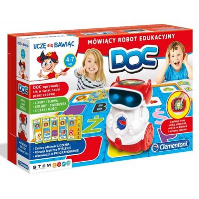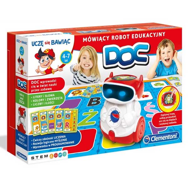 Clementoni Doc Mówiący Robot EdukacyjnyDoc Mówiący Robot Edukacyjny zaprojektowany przez cenionego producenta zabawek dla dzieci, włoską firmę Clementoni przeznaczone są dla dzieci od 4-go roku życia. Taki robot to doskonały towarzysz w rozwijaniu logicznego rozumowania i umiejętności rozwiązywania problemów. Uczy liter, cyfr, kolorów i nazw zwierząt. Komputer robota nauczy Cię wykonywania poleceń programowych. DOC to pierwsza zabawka w historii, która przybliża dzieciom aspekty robotyki w przyjemny i twórczy sposób. Robot może być zaprogramowany tak, aby wędrować dowolnie lub według poleceń na kartach. Pomaga dziecku rozwijać myślenie logiczne i umiejętności rozwiązywania problemów.Wartości edukacyjne:- Zdolnosci Logicznego Myslenia I Obserwacji - Znajomosci I Rozumienia Swiata - Samodzielnosci - Pamieci - Kreatywnosci I Wyobrazni - Relacji Społecznych - Umiejetnosci ManualnychClementoni jest firmą z ponad 50-letnim doświadczeniem. Została założona przez Mario Clementoniego w 1963r. i szybko stała się synonimem kreatywności, pasji oraz dbałości o jakość. Clementoni powstało, aby pomóc dzieciom uczyć się poprzez wspieranie ich rozwoju za pomocą języka, który znają najlepiej i co przychodzi do nich w sposób naturalny - za pomocą zabawy."Zabawa to poważna sprawa. Nigdy nie powinniśmy przestawać się bawić,szczególnie gdy stajemy się dorośli mawiał założyciel firmy Mario Clementoni.6,00 x 27,80 x 41,80 cm