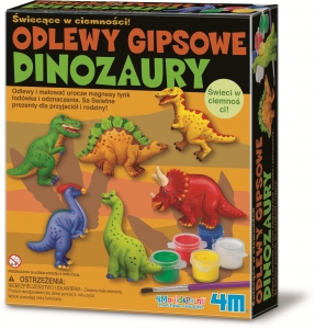 Odlewy gipsowe - Dinozaury świecące w ciemności to niesamowita plastyczna przygoda dla każdego dziecka!Zestaw pozwala na samodzielne stworzenie różnorodnych magnesów na lodówkę bądź broszek - w zależności od upodobań.Zabawa jest niesamowicie prosta:1. Odlej wybrany kształt,2. Umieść magnes lub wpinkę,3. Pomaluj - gdy użyjesz farby fluorescencyjnej dinozaury będą świecić w ciemności,