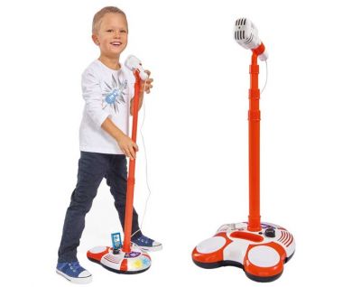 Zabawka jest przystosowana do współpracy z każdym odtwarzaczem Mp3.i-Mikrofon mp3 rozwija zdolności muzyczne i wyobraźnię - dziecko samo tworzy teksty do istniejących podkładów lub może korzystaćz ulubionych utworów z zewnętrznego odtwarzacza.Zabawka wyposażona jest w: moduł dźwiękowo świetlny 4 rytmy demonstracyjne włącznik / wyłącznik regulację głośnościStatyw posiada regulację wysokości od 51 do 102 cm.Zabawka wymaga zasilania bateriami (4 x 1,5V R6)