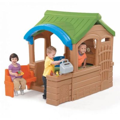 grodowy Domek z grillem i ławeczką STEP2Domek z grillem i ławeczką to Absolutna nowość amerykańskiej firmy Step2. Fantastyczny pomysł na letnie grilowanie. Domek wyposażony jest w kominek oraz wbudowany na werandzie gril. Dzieki ławeczce maluchy będą mogły poczuć się jak na prawdziwym patio, zajadając przepysznie przygotowane potrawy. Dodatkowo przygotowany został kran z blacikiem wokół, co ułatwi posprzątanie naczyń po spotkaniu z przyjaciółmi.W skład zestawu wchodzą 5 akcesoriów niezbędnych podczas grillowania: widelec, łopatka oraz szczypce jak również buteleczki ketchupu i musztardy.Domek jest bardzo jasny dzięki niewielkim drzwiom oraz dużym oknom. Dodatkowo w drzwiach zamontowany jest elektorniczny dzwonek z realistycznymi dźwiękami.