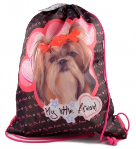 Worek szkolny My Little Friend. Jest to worek na obuwie lub strój gimnastyczny wykonany z wysokiej jakości materiałów odpornych na wilgoć. Posiada podwójne boczne sznurki, które umożliwiają noszenie worka w rękach, na ramieniu, a nawet na plecach. Worek posiada z jednej strony nadruk uroczego pieska Shih Tzu, z drugiej strony miejsce na podpisanie worka.Wzornictwo dopasowane do kolekcji artykułów z serii MLF Shih Tzu czyni go doskonałym uzupełnieniem szkolnej wyprawki.ZAWARTOŚĆ:- worek z podwójnymi bocznymi sznurkami do ściąganiaWIEK:powyżej 5 latWYMIARY:worka pustego ok: 32 x 44 cmUWAGI:Nieodpowiednie dla dzieci w wieku poniżej 3 lat z uwagi na ryzyko zranienia i połknięcia. Zachować opakowanie ze względu na ważne informacje.