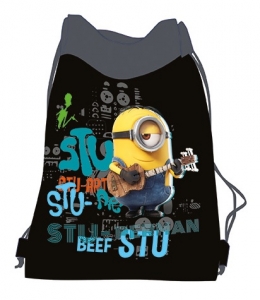 Worek szkolny Minionki.Jest to worek szkolny, w którym Twoje dziecko może przenosić obuwie, strój sportowy bądź inne niezbędne rzeczy.Worek idealnie sprawdzi się w szkole i w przedszkolu. Dzięki podwójnym sznurkom ściągającym worek można nosić na plecach.Na przodzie worka znajduje się nadruk Minionka - Stu, na drugiej natomiast znajduje się miejsce na podpisanie worka oraz krateczka - wywietrznik.ZAWARTOŚĆ:Worek posiada:- podwójne sznurki ściągające,- miejsce na podpisanie,- wywietrznik, - modny wzór,- wysokiej jakości materiały.WIEK:5 +WYMIARY: worka pustego ok: 32 x 44 cmUWAGI:Nieodpowiednie dla dzieci w wieku poniżej 3 lat z uwagi na ryzyko zranienia i połknięcia. Zachować opakowanie ze względu na ważne informacje.