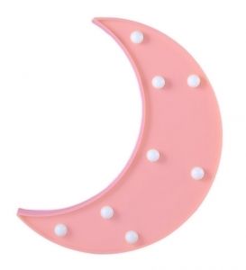 Wspaniała, dekoracyjna lampka LED w kształcie księżyca.Wykonana z plastiku, koloru różowego.DANE TECHNICZNE:- 8 żarówek LED- Zasilanie: 2 baterie AA (brak w zestawie)WYMIARY:- 24 x 18 x 3 cmUWAGI:Produkt nie nadaje się dla dzieci poniżej 3 lat.