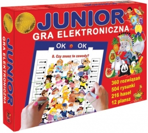 Gra Junior - wiem wszystko to świetna gra edukacyjna dla każdego przedszkolaka.Gra jest niezwykle prosta.Na 12 planszach znajduje się 420 rysunków o różnorodnej tematyce.Przy każdym z nich znajduje się czarny punkt. Gracz dotyka jednocześnie dwa skojarzone ze sobą punkty na planszy za pomocą specjalnych długopisów.W przypadku prawidłowej odpowiedzi zapali się lampka.Dzięki tej zabawie Twoje dziecko szybko nauczy się kojarzyć zawody, zwierzęta itd. oraz ich nazwy.Ważnym jest, że plansze w grze zawierają zarówno hasła (nazwy) jak i obrazki. Dodatkową atrakcją dla dziecka jest fakt, że gra jest elektroniczna. ZAWARTOŚĆ:gra Junior - 12 plansz WIEK:4+WYMIARY:opakowania: 37 x 23 x 5 cm UWAGI:Nieodpowiednie dla dzieci poniżej 3 roku życia.