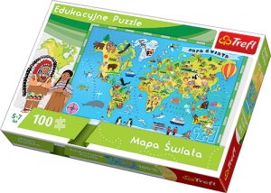 Mapa Świata - Puzzle EdukacyjneMapa Świata to puzzle, które zwrócą uwagę zarówno dzieci, jak i ich rodziców.Prezentowane puzzle w przyjazny sposób łączą zabawę z nauką oraz pobudzają wyobraźnię i ciekawość świata.Układanka została specjalnie dostosowana do możliwości poznawczych dzieci w wieku 5-7 lat.Po ułożeniu powstanie obrazek o wymiarach 60x40 cm.ZAWARTOŚĆ:100 puzzliWIEK:od 5 latWYMIARY:33 x 23 x 5,5cmUWAGI:Nieodpowiednie dla dzieci poniżej 3 roku życia. Istnieje ryzyko zadławienia się małymi elementami.