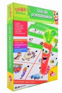 Quiz dla przedszkolaków to idealna zabawka edukacyjna dla najmłodszych dzieci!W zestawie znajdują się różnego rodzaju zadania dydaktyczne opracowane na podstawie programu nauczania przedszkolnego.Gdy odpowiadasz na pytania quizu, magiczna Marchewka powie Ci, czy udzieliłeś dobrej odpowiedzi.Pakiet zawiera wiele quizów i zabaw dydaktycznych na różnych poziomach.Quiz porusza różnorodną tematykę:* ciało i ruch* mowa i słowa* poznawanie świata* ja i inni* język, kreatywność, wyrażanie.Posiada aż 30 aktywności dydaktycznych!