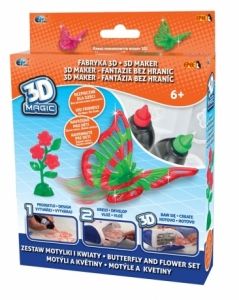 Oferowany zestaw jest uzupełnieniem zestawu podstawowego.Zestaw artystyczny 3D MAGIC to wymarzony start dla młodego pasjonata tworzenia własnych trójwymiarowych obrazków.Dzięki magicznemu zestawowi stworzy konkretne kształty, które później połączy w zadziwiające figury 3D.Zestaw pobudza zarówno zmysły plastyczne dziecka, jak i zamiłowanie do majsterkowania i różnego rodzaju prac technicznych.W zabawce została wykorzystana innowacyjna technologia utwardzania żelu światłem UV.Zabawa jest bardzo prosta.Na szablonie nanieś wzór kolorowym magicznym żelem, umieść w suszarce, po minucie żel stwardnieje i gotowa jest Twoja praca w 3D.Baw się i rozwijaj wyobraźnię dzięki możliwością Fabryki 3D!ZAWARTOŚĆ:- 2 kolorowe magiczne żele czerwony i zielony, - 2 formy 3D (motyl i kwiat),- 1 szablon motyl 3D,- 1 szablon do realizacji własnych pomysłów ,- instrukcjaWIEK:6 lat +WAGA:650 gWYMIARY:opakowania 15,5 x 20,5 x 4 cmUWAGI:Nieodpowiednie dla dzieci w wieku poniżej 3 lat, ze względu na drobne elementy łatwe do połknięcia - ryzyko udławienia