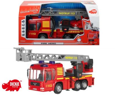 Rewelacyjny samochód z serii pojazdów ratowniczych SOS. Wóz strażacki z wysuwaną drabiną oraz prawdziwą pompką wodną zapewni chłopcom dużą frajdę i wiele godzin fantastycznej zabawy. moduł dźwiękowo świetlny na dachu kabiny zapewnia dodatkowe atrakcje kogut świeci na niebiesko a 3 przyciski, znajdujące się na górze kabiny kierowcy dają możliwość użycia 3 sygnałów naśladujących dźwięki prawdziwego wozu strażackiego na wyposażeniu znajduje się gumowy wąż - sikawka, pompa i pojemniczek na wodę, które pozwalają gasić pożary dzięki teleskopowej drabinie na obrotowej platformie, mały strażak uratuje ludzi z płonącego budynku drabinę można wysunąć aż na 70 cm dla bezpieczeństwa i stabilizacji wóz ma podpory boczne dach kabiny można zdjąć i umieścić w środku np. małą figurkę - kierowcę samochód posiada atrapę walkie-talkie która zawiera przycisk, który dziecko wykorzystuje do włączania sygnalizacji dźwiękowej i świetlnej