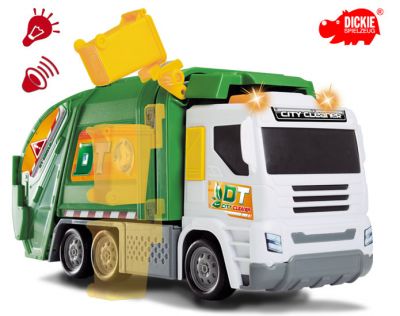 Dickie Śmieciarka Śmieciarka biało-zielona sprawi radość każdemu chłopcu, niezależnie od wieku! Pojazd ma ok. 30cm długości, dodatkowo do pojazdu dołączano kosz na śmieci. Śmieciarka jest doskonałym odwzorowaniem pojazdów, które spotykamy na polskich drogach, a dzięki ruchomym elementom zapewni wielogodzinną zabawę.