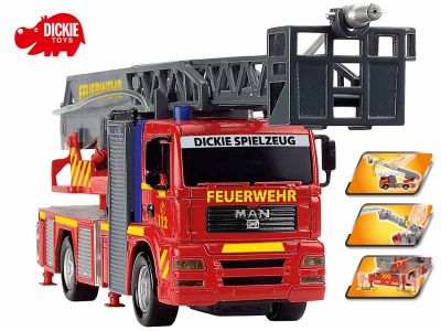 Wóz Strażacki City Fire Engine jest doskonałym odwzorowaniem pojazdów firmy MAN, które spotykamy na polskich drogach, a dzięki ruchomym elementom zapewni wielogodzinną zabawę, uzależnioną od kreatywności malucha.Rewelacyjny Wóz Strażacki z kabiną zamontowaną na wysięgniku zapewni maluchowi moc wyśmienitej zabawy! Wygląda on niezwykle realistycznie, do złudzenia przypomina te prawdziwe!Pojazd jest wyposażony w zbiorniczek na wodę i pompkę. Po wciśnięciu przycisku woda zaczyna tryskać z sikawki zamontowanej na końcu wysięgnika. Wóz po bokach ma zamontowane rozkładane podpórki, które zapewniają stabilność pojazdu. W pojeźddzie zamontowany jest moduł dźwiękowo świetlny. Pojazd wymaga zasilania bateriami (2 x 1.5V R6). Baterie w zestawie.