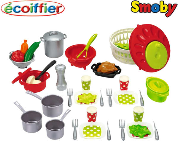 Smoby Ecoiffier Zestaw Naczyń Z Suszarką Do Sałaty 47 elementówZestaw naczyń z suszarką do sałaty marki Ecoiffier francuskiej firmy Smoby stanowi wspaniałe uzupełnienie zestawów kuchennych. Mała gospodyni/gospodarz będą wreszcie mogli podawać przepyszne dania na przyjęciach swoich lal i misiaków. Zestaw zawiera: 4 talerzyki i filiżanki komplet sztućcy czajniczek suszarkę do sałaty komplet garnków warzywa kurczakaŁącznie 47 elementów.Dzięki tej zabawce maluchy mogą także nauczyć się, że po przyjęciu naczynia należy umyć i ustawić na suszarce, aby wyschły i były zawsze czyste.