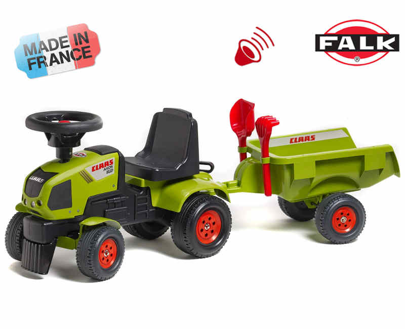 FALK Traktor PRZYCZEPA Jeździk CLAAS AXOS ZielonyTraktor ten to spełnienie marzeń niejednego małego traktorzysty i budowniczego.Starannie wykonany, z dbałością o najmniejszy szczegół !!!Żaden Prawdziwy Farmer by takim nie pogardził :)Idealny prezent na każdą okazję! Zestaw zawiera: klakson, skrętną przednią oś, dopinaną przyczepę, grabki, łopatkę, wyższe siedzenie.Wykonany z wysokiej jakości tworzywa sztucznego.Wiek:12 m +Wymiary: długość zestawu 97 cm, szerokość 30 cm, wysokość całkowita 37 cm, wysokość od ziemi do siedzenia to około 25 cm.