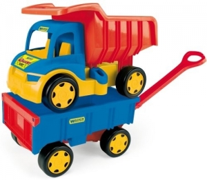Gigant Truck - Wywrotka + Przyczepa Wader 65100Zestaw dwóch pojazdów z serii Gigant, charakteryzujących się ogromną wytrzymałością.Gigant Truck Wywrotka to okazały samochód o długości 55 cm i ogromnej nośności do 150 kg. Przyczepa wytrzymuje nośność do 60 kg.Zastosowana kolorystyka zestawu jest odmienna od tych samych zabawek sprzedawanych w wersji solo.Auto charakteryzuje się nowoczesnym wyglądem, zaokrąglonymi krawędziami i bogatą kolorystyką.Zestaw doskonale nadaje się zarówno do zabawy w domu, jak i w ogrodzie, czy piaskownicy i jest idealny dla dzieci w wieku 2-5 lat.Największą zaletą zabawki jest solidność konstrukcji, dzięki której samochód służy zabawie latami.Zabawki WADER kierowane są do dzieci do 7 lat. Podstawową ich zaletą jest bezpieczeństwo oraz wysoka jakość.Zabawki Wader posiadają także walory edukacyjne, ponieważ:- pobudzają kreatywność i wyobraźnię dziecka,- poprawiają umiejętności manualne i motoryczne,- polepszają zdolności intelektualne - zdolność kojarzenia kształtów i kolorów.- umożliwiają integrację z rówieśnikami – sprawdzają się w zabawie w grupie.Produkt posiada Europejski Certyfikat Jakości i Bezpieczeństwa CE.ZAWARTOŚĆ:-wywrotka-przyczepaWIEK:1+WYMIARY:wymiary opakowania: 55 x 59 x 33 cmwymiary zabawki: 55cm + 90 cm przyczepaUWAGI:Nieodpowiednie dla dzieci w wieku poniżej 12 miesięcy