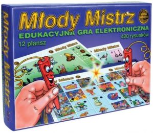 Gra Młody Mistrz - wiem wszystko to świetna gra edukacyjna dla każdego przedszkolaka.Gra jest niezwykle prosta.Na 12 planszach znajduje się 420 rysunków o różnorodnej tematyce.Przy każdym z nich znajduje się czarny punkt. Gracz dotyka jednocześnie dwa skojarzone ze sobą punkty na planszy za pomocą specjalnych długopisów.W przypadku prawidłowej odpowiedzi zapali się lampka.Znajdziemy tu różne zabawy, np.: kto gdzie mieszka?, połącz w pary, czy odszukaj kolory.Dodatkową atrakcją dla dziecka jest fakt, że gra jest elektroniczna. ZAWARTOŚĆ:gra Młody Mistrz - 12 plansz WIEK:4+WYMIARY:opakowania: 33 x 24 x 5 cmZASILANIE:1 x bateria 9V 6LF22 - brakInstrukcja użytkowania baterii w Regulaminie UWAGI:Nieodpowiednie dla dzieci poniżej 3 roku życia.