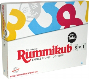 Rummikub Twist 3w1 to wspaniała gra towarzyska.Prosta, wciągająca, inna w każdej rozgrywce.Doskonała rozrywka dla całej rodziny.Celem gry jest pozbycie się wszystkich kostek z liczbami ze swojej tabliczki.Gracz, który dokona tego jako pierwszy- wygrywa. Polska edycja Rummikub Twist 3w1 zawiera 3 wersje gry: Standard (z 2 Jokerami),Twist (z 8 specjalnymi Jokerami)Expert (z 8 kolorowymi Jokerami).   Cel gry:Celem wszystkich graczy jest wyłożenie na stół wszystkich posiadanych kostek w taki sposób, by zdobył jak największą liczbę punktów.