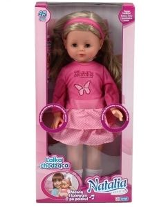 Chodząca lalka Natalia to najlepsza propozycja dla wszystkich dziewczynek. Lalka jest urocza, ubrana w śliczne ciuszki, a poza tym śpiewa, mówi i chodzi.Natalia przygotowała dla dziecka śpiewnik, aby można było z Nią śpiewać w duecie, co urozmaici Twojemu dziecku zabawę.Jest to Natalia (bez grzywki) z różową opaską na głowie, ubrana w różową spódniczkę w białe kropeczki, różową bluzeczkę, białe skarpetki i różowe buciki.Natalia zna i chętnie śpiewa następujące piosenki:* "Pieski małe dwa",* "Stary niedźwiedź mocno śpi",* "Mam chusteczkę haftowaną"* "Misia A, Misia B".Gdy naciśniemy lewą rączkę lalki, zacznie mówić, natomiast gdy naciśniemy na jej prawą rączkę - zacznie chodzić i śpiewać.Lalka mówi i śpiewa po polsku.Natalia mówi wesołym, miłym głosem: * "Cześć, jestem Natalia",* "Pobawmy się"* "Zaśpiewajmy piosenkę",* "Chodźmy razem na spacer",* "Lubię, jak się ze mną bawisz".ZAWARTOŚĆ:- Lalka Natalia- Książeczka z piosenkami.WIEK: