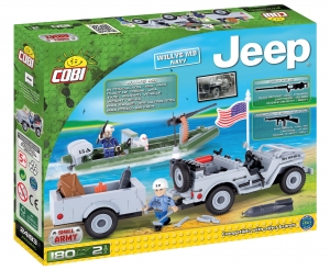 Z Zestawu zbudujesz Jeepa Willysa wraz z przyczepką, na której można przewieźć niezbędny i ciężki sprzęt. Wśród akcesoriów znajdziesz szpadel oraz gaśnicę zamontowaną na jednym z boków samochodu, pociski, dynamit, kanister, narzędzia wraz ze skrzynią. Nabrzeża patroluje łódź motorowa, na której żołnież obserwuje lornetką teren. Żołnierze mają do dyspozycji broń: karabin maszynowy browning M2 i pistolet maszynowy Thompson.projektowany przez koncern Willys-Overland, stał się podstawowym lekkim pojazdem rozpoznawczym amerykańskich sił zbrojnych. Pierwszy cywilny Jeep pojawił się już w 1944 roku i od tego momentu jego popularność rośnie. ZAWARTOŚĆ: - 180 klocków,- 2 figurki- czytelna instrukcja. WIEK: 3 lata+ WYMIARY: opakowania 19 x 14 x 5,5