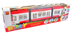 Jeżdżący tramwaj światło i dźwięk, to wspaniała zabawka dla każdego chłopca.Na górze pociągu umieszczone są cztery guziczki.Po naciśnięciu trójkątów włączają się odgłosy jadącego pociągu, zapalają się światła w pociągu w kolorze czerwonym, zielonym i niebieskim oraz białe światła z przodu i tyłu a pociąg jedzie do przodu lub do tyłu (w zależności który guzik naciśniemy. Gdy naciśniemy kwadrat, wewnątrz pociągu zaświecą się światła w kolorze czerwonym zielonym i niebieskim, a głos zapowie przyjazd pociągu.Po naciśnięciu okrągłego guziczka usłyszymy wesołą melodyjkę, a wnętrze pociągu rozbłyśnie kolorami.Pojazd posiada podnoszony pantograf.ZAWARTOŚĆ:- jeżdżący pojazd w kolorze czerwonym światło i dźwiękWIEK:3 lata+WYMIARY:opakowania 49 x 8,5 x 13,5 cmpociągu długość ok.42 cmWAGA:585 gZASILENIE:3 x 1,5V AA - załączoneInstrukcja użytkowania baterii w regulaminie.UWAGI:Nieodpowiednie dla dzieci do lat 3.