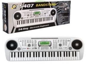 KEYBOARD MQ5407Wspaniałe organy dla Twojego dziecka, doskonale nadają się do nauki.Klawiatura pozwala rozbudzić pasję muzyczną i duszę artystyczną.Od małego, dzieci zwracają uwagę na przeróżne dźwięki i przyswajają je w szybkim tempie, co wzbudza kreatywne myślenie.Instrument jako jeden z nielicznych, pozwala na monitorowanie parametrów jak głośność, rytm czy tempo.Dołączony mikrofon pozwala na połączenie muzyki elektronicznej ze śpiewem dziecka.Jest to idealny prezent dla dziecka, który zapewni mu godziny świetnej zabawy.Organy zapakowane są w kolorowe pudełko.DANE TECHNICZNE I FUNKCJE:- 2 głośniki STEREO- 2 wyjścia z tyłu (na mikrofon oraz na dodatkowe głośniki)- Wyświetlacz LCD podświetlany na zielono- 54 klawisze- 10 piosenek- 100 różnych tonacji- 100 różnych rytmów- 5 rodzajów perkusji- 2 tryby nauki- Nagrywanie i odtwarzanie- Przycisk głośności oraz tempaPARAMETRY:Długość: 60 cmSzerokość: 20 cmZasilanie: 230V oraz opcjonalnie na baterie (6 x AA - brak w zestawie)ZAWARTOŚĆ ZESTAWU:- Keyboard- Przewód zasilający- MikrofonWYMIARY OPAKOWANIA:- 63 x 23 x 10 cm