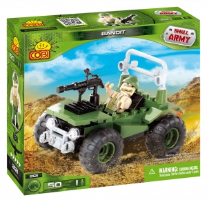 Mała Armia to klocki dla małych strategów wojennych, pasjonatów działań wojennych na lądzie, morzu i w powietrzu.Dzięki nim chłopcy mają zapewnioną fantastyczną przygodę, zabawę strategiczną w wojsko. Mogą budować legendarne oddziały wojskowe walczące w słusznej sprawie na morzu, czy na lądzie. Klocki te bez wątpienia od razu przyciągną uwagę Twojego dziecka, które samo budować będzie pojazd bandyty z działkiem. Dziecko może się nim bawić bez końca: jeździć, walczyć i przebudowywać. Zabawka jest niezwykle realistyczna. Bandyta posiada wszystkie potrzebne elementy - broń czy hełm.