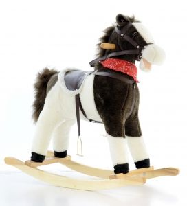 Konik bujany. Zabawka wykonana jest z bardzo miłego w dotyku materiału. Konik posiada wygodne siedzisko ze strzemionami i lejcami (wybrane modele) oraz drewniane rączki.Zabawka po naciśnięciu ucha wydaje różne dźwięki i rusza ogonkiem i mordką.