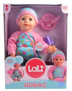 Lalka Lali to źródło niesamowitej radości dla każdej dziewczynki. Lalka posiada mięciutkie rączki i nóżki, natomiast głowę, dłonie i stopy wykonane ma z gumy, w brzuszku lalki umieszczony został mechanizm oraz przycisk interaktywny, aktywujący funkcje lalki.Lali ubrana jest w śpioszki - spodenki są różowe i posiadają kieszonkę, natomiast bluzeczka jest biała w kolorowe kropeczki, posiada także czapeczkę.Funkcje lalki:- śpiewa- mówi- liczy swoje paluszki- rusza buzią kiedy je i pije.Bobasek jest cudowną lalką, która wypowiada zdania i śpiewa. Lalka mówi:- Hura! Czas na jedzonko!- Jestem głodna. - Mamusiu, proszę o ciasteczko.- Chce mi się pić. Czy możesz dać mi soczek?- Pobawmy się razem. Złącz moje rączki i zaśpiewajmy piosenkę.- Mamusiu, potrafię policzyć swoje paluszki. Złącz moje rączki.- Mamusiu złącz moje rączki i zaklaszczmy razem.Przekonaj się, jak świetnie można się z nią bawić! Z pewnością nauczysz się czegoś nowego. W zestawie znajdziesz także książeczkę dla Twojej lali - będziesz mogła wybrać dla niej imię i opisywać wasze wspólne przygody.Lalka ubrana jest w śliczne śpioszki oraz czapeczkę do kompletu. Posiada w zestawie miseczkę z łyżką, kubeczek i ciasteczko. ZAWARTOŚĆ:- lalka Lali- talerzyk z łyżeczką- kubeczek- ciasteczko- książeczkaWIEK:od 3 lataWYMIARY:lalki: ok 40 cm opakowania: 42 x 31 x 13 cmZASILANIE:3 x baterie AA 1,5V - załączone UWAGI:Ze względów bezpieczeństwa usuń wszystkie plastikowe lub gumowe opaski i przywieszki oraz pozostałe mocowania zanim podasz zabawkę dziecku do zabawy.