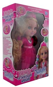 Długowłosa, piękna księżniczka, która po naciśnięciu medalionu wypowiada pozytywne frazy i śpiewa 2 piękne piosenki o spełnianiu marzeń i dążeniu do celu!Najlepsza przyjaciółka każdej dziewczynki, która każdego dnia będzie powtarzać jej to, co powinna słyszeć codziennie i zapamiętać!Lalka ubrana jest w przepiękną różową sukienkę a na głowie ma tiarę.Włosy Natalii są bardzo bardzo długie można je czesać i układać wspaniałe fryzury, dzięki załączonym spinkom.Najważniejsze jest jednak to, że jej włosy świecą! ZAWARTOŚĆ:- Lalka Natalia księżniczka ze świecącymi włosami WIEK:3 lata+ WAGA:880 g WYMIARY:wysokość lalki: ok. 35 cmwielkość opakowania: 40 x 25 x 12 cm ZASILANIE:3 x 1,5 V AAA - załączone baterie testowe.Instrukcja z użytkowania baterii w regulaminie. UWAGI:Zabawka nieodpowiednia dla dzieci w wieku poniżej 3 lat. Możliwość wystąpienia małych elementów- niebezpieczeństwo połknięcia.Zaleca się zachowanie opakowań, etykiet bądź instrukcji, na których umieszczone są ważne informacje.Zawartość może różnić się od fotografii na opakowaniu.