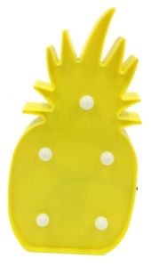 Wspaniała, dekoracyjna lampka LED w kształcie ananasa.Wykonana z plastiku, koloru żółtego. DANE TECHNICZNE:- 5 żarówek LED- Zasilanie: 2 baterie AA (brak w zestawie)WYMIARY:- 24,7 x 13 x 2,8 cmUWAGI:Produkt nie nadaje się dla dzieci poniżej 3 lat.