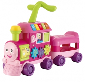 Lokomotywa 3 w1 rośnij ze mną.- Interaktywna zabawka, pchacz i jeździk!Lokomotywka to prawdziwa zabawka na dłużej.Lokomotywka mówi po polsku miłym dziecięcym głosem.Przy włączaniu trąbi jak prawdziwy pociąg i mówi "Bileciki do kontroli"Kiedy nie ruszamy jej nakazuje "Proszę odejść od torów", bądź wydaje odgłosy przejazdu kolejowego.Przy wyłączaniu lokomotywka oznajmia "Odjeżdżamy, odjeżdżamy!" i wygrywa wesołą melodyjkę.Lokomotywka uczy kształtów, kolorów, zwierzątek i może pobudzić Twoje dziecko do mówienia i chodzenia!Posiada aż 3 funkcje :1. Już 10-miesięczny malec może bawić się mnóstwem atrakcji na lokomotywie.Mrugający komin oraz wesołe, skoczne piosenki zachęcają nieustannie do zabawy.Pojazd posiada zamykane okienka - w jednym jest konduktor, a w drugim pasażerowie.Przy otwieraniu/zamykaniu okienka lokomotywka wydaje śmieszne dźwięki.Okienka zmieniają funkcje górnych klawiszy.Kiedy otwarte jest okienko z pasażerami z klawiszy robi się pianinko.Gdy otwarte jest okienko z konduktorem klawisze uczą literek i kolorów.Pod okienkami znajdują się koła zębate, którymi można kręcić.Jak to zrobimy wydaja one różne dźwięki.2. Gdy nasza pociecha zacznie wstawać stabilny pchacz może mu pomóc stawiać pierwsze kroki.Wystarczy zamontować rączkę do pchania, a zobaczymy jak szybko nasza pociecha się uczy.3. Po założeniu wagonika, dziecko uzyskuje jeździk, odpychacz.Wtedy lokomotywkę już możemy zabierać na spacer. ZAWARTOŚĆ: Lokomotywa posiada:Rączkę do pchania,Przyciski muzyczne,Włącznik/regulator głośnościPrzesuwane okienka,Ruchome koła zębate,Kolorowe obrazki.