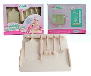 Mała Kuchareczka to drewniany zestaw kuchenny dla najmłodszych.Teraz dziecko może razem z mamą bawić się w kuchni swoimi zabawkami i pomagać jej w gotowaniu.Zabawka jest prosta i wytrzymała, ponadto stanowi gwarancję świetnej zabawy.Zestaw wyprodukowany jest w Polsce z najlepszego naturalnego drewna. Jest bezpieczny dla Twojego dziecka. ZAWARTOŚĆ: wałek,młotek,rogalka,tłuczek,deseczka,stolnica