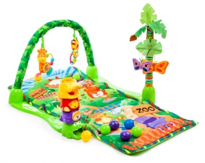 SUPER MATA EDUKACYJNA ZOO Z BEZPIECZNYM LUSTERKIEMWielofunkcyjna mata edukacyjna ZOO wykonana została z kolorowego, miękkiego i wysokiej jakości materiału.Doskonale sprawdzi się jako mata gimnastyczna dla dzieci już od pierwszych chwil życia.Dołączone do niej kolorowe zabawki w zachęcą każdego malucha do zabawy, a dodatkowo będą pobudzać zmysły i wspomagać rozwój motoryczny każdego maluszka.Doskonała dla dzieci już od pierwszych chwil życia. ZAWARTOŚĆ:mata6 piłek4 kolorowe zwierzątkagrająca żyrafa ze świecącym brzuszkiemtygrysek z grzechotkąelastyczny pałąkkolorowa palma z listkami i motylkamibezpieczne lusterko-słoneczko Sposoby zabawy na macie edukacyjnej:1. Leżąc na pleckach bawiąc się zawieszonymi zabawkami.2. Leżąc na brzuszku i ćwicząc mięśnie.3. Zabawa na siedząco. Wymiary:długość 93 cmszerokość całkowita 55 cmwysokość pałąka 43 cmwysokość palmy 43cmwysokość wieży (kuleczkowa fontanna) 27 cm