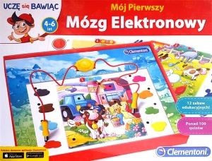 Mój Pierwszy Mózg Elektronowy to zabawna edukacyjna gra z ilustrowanymi quizami przeznaczona dla dzieci w wieku od 6 do 6 lat.12 zadań przedstawionych na planszach uczy rozpoznawania kolorów, kształtów, liczb, przeciwieństw i stymuluje zmysł obserwacji, umiejętność koncentracji oraz logicznego kojarzenia.Aby wziąć udział w quizie dziecko wprowadza jedną wtyczkę do otworu przy pytaniu, a drugą do otworu przy odpowiedzi.Jeśli połączenie jest poprawne, słoneczko się rozświetla.ZAWARTOŚĆ:- 12 kart (ponad 100 quizów) z zabawami edukacyjnymi- 2 wtyczki do udzielania odpowiedzi- instrukcjaWIEK:4 - 6 latWYMIARY:wymiary opakowania: 37 x 28 x 6cmZASILANIE:2x 1,5V L736/LR41 - załączone demonstracyjneUWAGI:Nie nadaje się dla dzieci w wieku poniżej 36 miesięcy.Zawiera małe części, które łatwo połknąć lub które mogą się dostać do dróg oddechowych. Niebezpieczeństwo uduszenia.