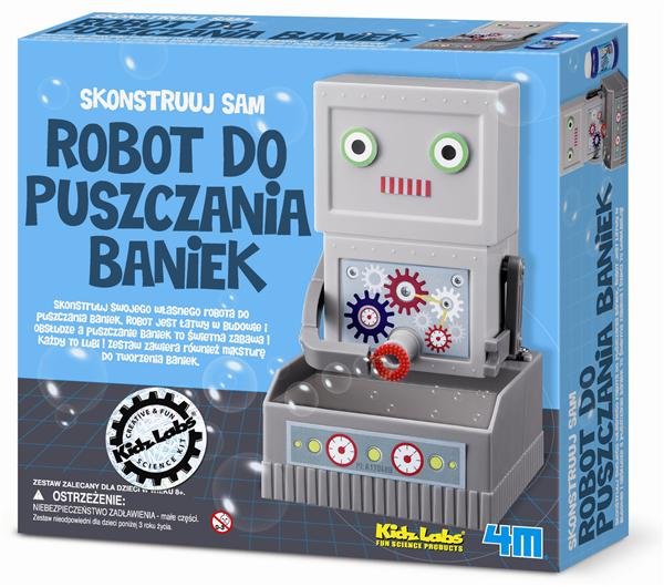 ROBOT DO PUSZCZANIA BANIEK Dla dzieci powyżej 8. roku życia. Zestaw nieodpowiedni dla dzieci poniżej 3 roku życia. Skonstruuj własnego robota do puszczania baniek. Robot jest łatwy w budowie i obsłudze, a puszczanie baniek to wspaniała zabaw dla ciebie i twoich przyjaciół. Każdy to lubi ! Zestaw zawiera również miksturę do tworzenia baniek. ZAWARTOŚĆ ZESTAWU:- elementy robota do złożenia - mikstura do robienia baniek. Wielkość opakowania: 21x23x6 cm.