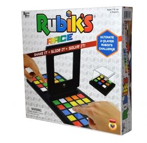 Rubik's race potrząsaj, przesuwaj, rozwiązuj.Ścigaj się przesuwając kolorowe płytki, by jako pierwszy ułożyć wylosowany wzór kolorów - przedstawiony w pojemniku do mieszania mini kostek.JAK GRAĆ:1. przykryj pojemnik z mini kostkami dłonią i porządnie potrząśnij by pomieszać kostki.W dalszym ciągu przykrywając pojemnik dłonią, potrząśnij nim na boki, by kostki wskoczyły na miejsca.2. połóż pojemnik z mini kostkami obok gry, by odkryć ułożenie i rozpocznij wyścig.3. gracze przesuwają płytki dp momentu, gdy 9 środkowych płytek z tacki odpowiada ułożeniu Z pojemnika z mini kostkami.Rzędy z boku wokół układu ze środka nie liczą się w tej grze.Każdy z graczy musi odtworzyć ułożenie widziane ze swojej pozycji, nie z boku lub na odwrót.Gracz, który jako pierwszy odtworzy ułożenie, zatrzaskuje ramkę i wygrywa.Gra przeznaczona dl 2 graczy w wieku powyżej 5 lat.ZAWARTOŚĆ:- podstawka do gry z ramką - 3 części,- 48 kolorowych płytek,- pojemnik na mini kostki,- 9 kolorowych mini kostekWIEK:5 lat+WYMIARY:opakowania ok. 27 x 27 x 5 cmWAGA:485 gUWAGI:Nieodpowiednie dla dzieci poniżej 3 lat.